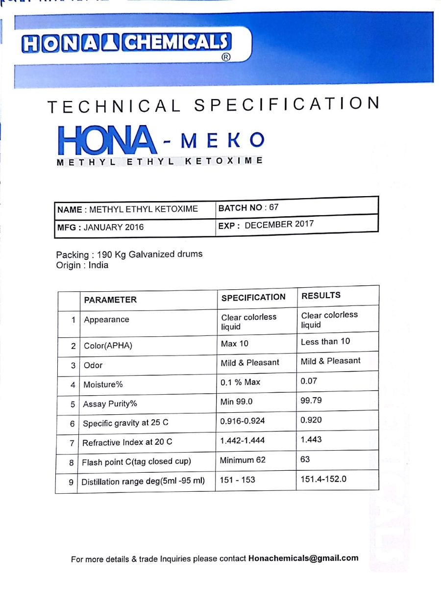 Product Name: ANTI Skinning -methyl ethyl ketone- MEKO Country of Origin: INDIA Brand: HONA Package Type: 190 KG Galvanized Drums